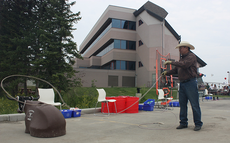 Alex Big Plume, analyste des terres à PGIC, démontre ses compétences en matière de capture du veau au lasso lors du petit déjeuner du Stampede organisé le 6 juillet par PGIC.