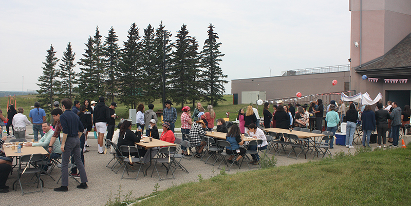 Des employés de PGIC, des membres de leur famille et des invités au petit déjeuner traditionnel du Stampede de Calgary tenu le 6 juillet dans la Nation des Tsuut'ina.